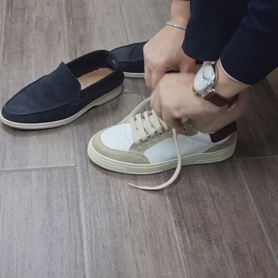 I Sneakers Gordon sono realizzate in vera pelle bottolato, con una combinazione di colori panna, beige e bordo. La suola in gomma ultraleggera garantisce un comfort duraturo durante la camminata. Prodotto interamente in Italia, è sinonimo di qualità e stile.
